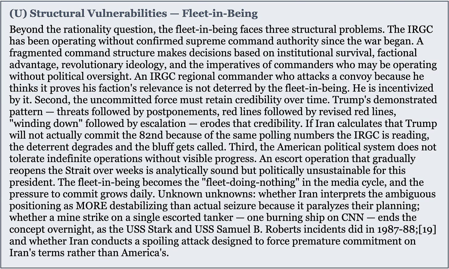 Fleet-in-being. The most unconventional option and possibly the smartest — but not without its own failure modes. The 82nd and the MEUs are not committed to island seizure. They are positioned visibly — everyone knows they are there, everyone knows what they are for — and escort operations begin under their umbrella.[21] The threat of seizure becomes the leverage, not the seizure itself. Iran must choose: let the escorts through and lose the Hormuz chokehold gradually, or attack the escorts and trigger the very seizure the IRGC is trying to prevent. This is a fleet-in-being concept applied to ground forces — a doctrinal principle in which an uncommitted force exerts strategic influence precisely because the adversary must plan against its potential employment.[22]