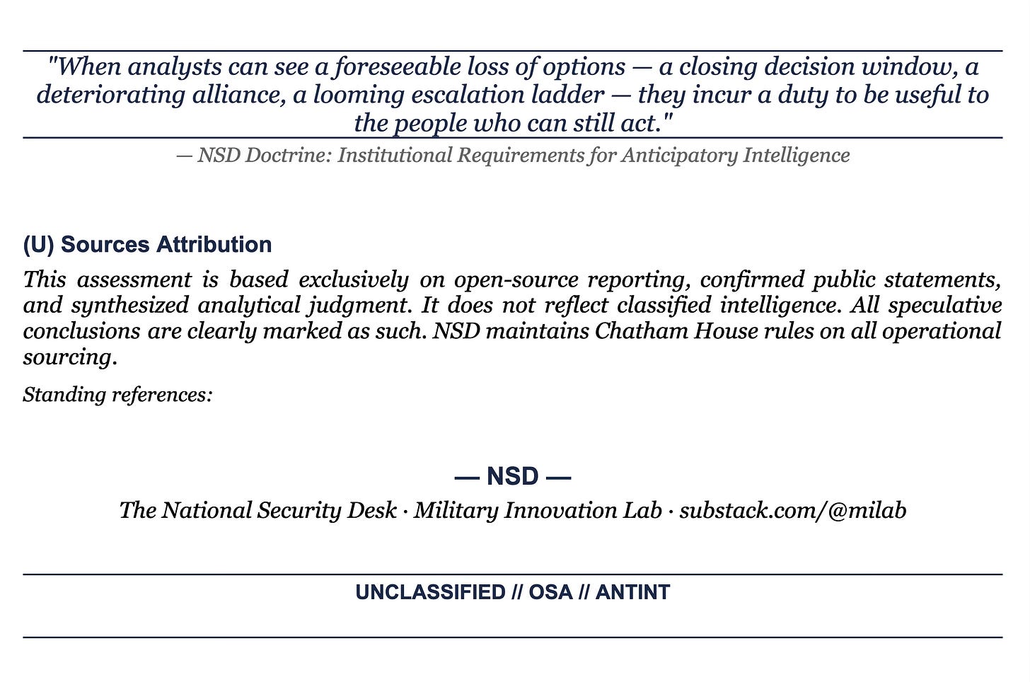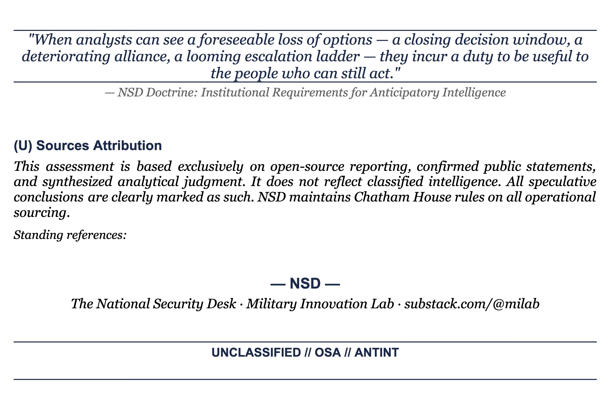 *When analysts can see a foreseeable loss of options — a closing decision window, a deteriorating alliance, a looming escalation ladder — they incur a duty to be useful to the people who can still act.* — NSD Doctrine: Institutional Requirements for Anticipatory Intelligence