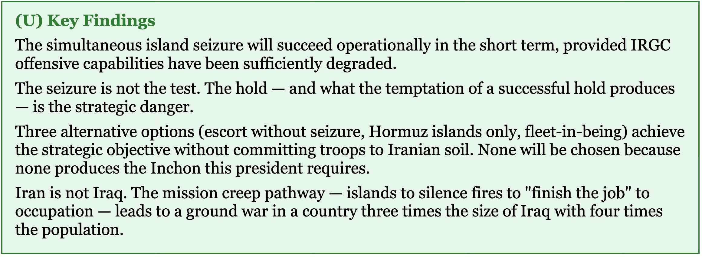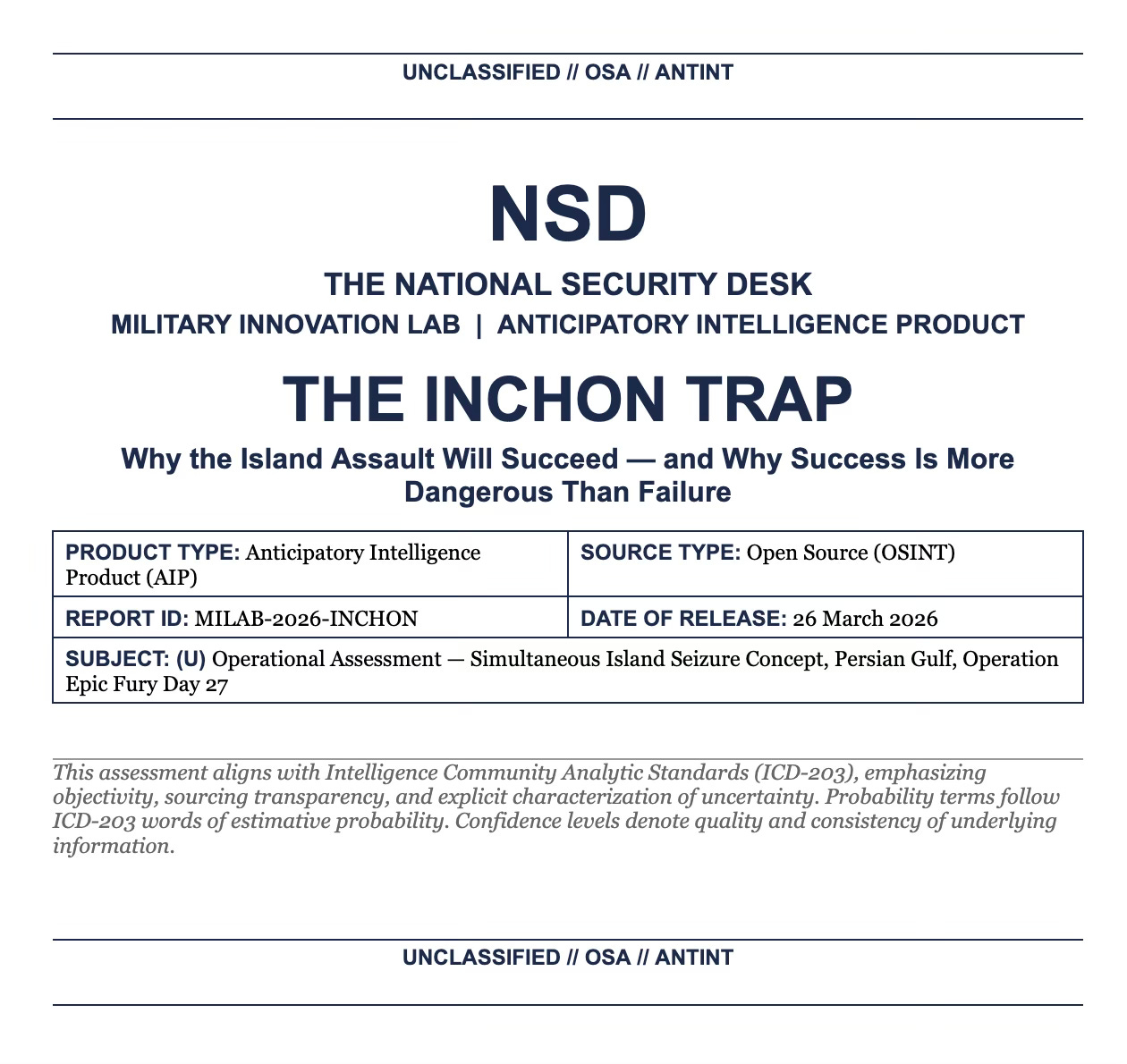 The simultaneous island assault will succeed. NSD assesses this with reasonable confidence. Trump may get his Inchon. But MacArthur got his too — and could not stop there. Seventy-five years later, American troops are still in Korea.[6] The trap is not the operation. The trap is what success makes you believe you can do next.