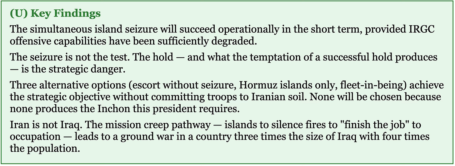 A deliberate campaign against Gulf desalination infrastructure would be, short of a nuclear weapon, the most extreme escalation available to Iran. And it is the logical response to an operation that seizes ninety percent of Iran’s oil export revenue and the coastal terrain that controls the Strait.[7-8] The question is not whether the US can take the islands. It is whether anyone in the administration has gamed what Iran does the morning after when it has nothing left to lose.