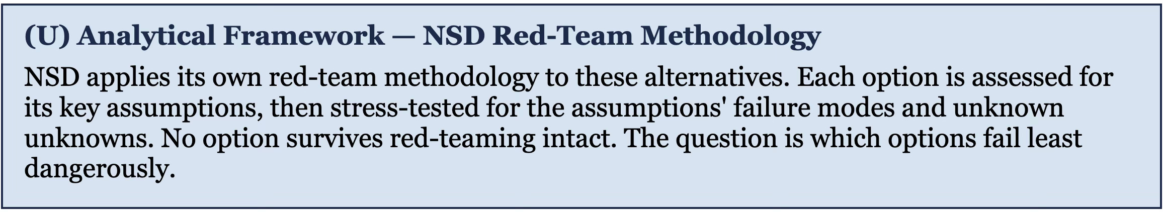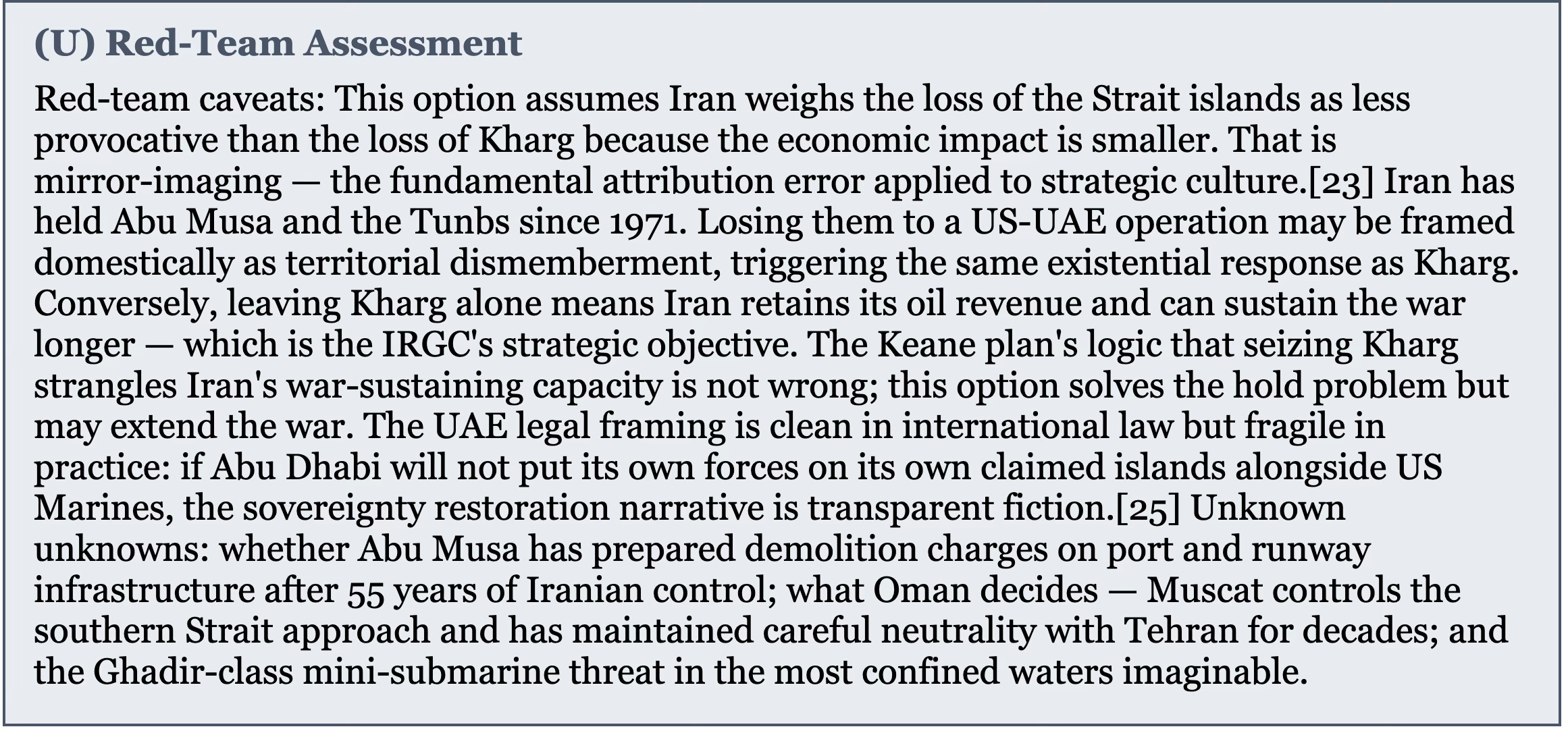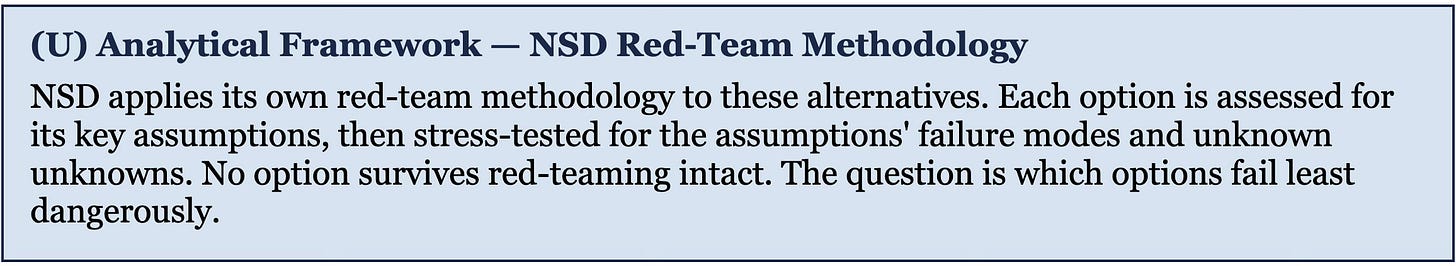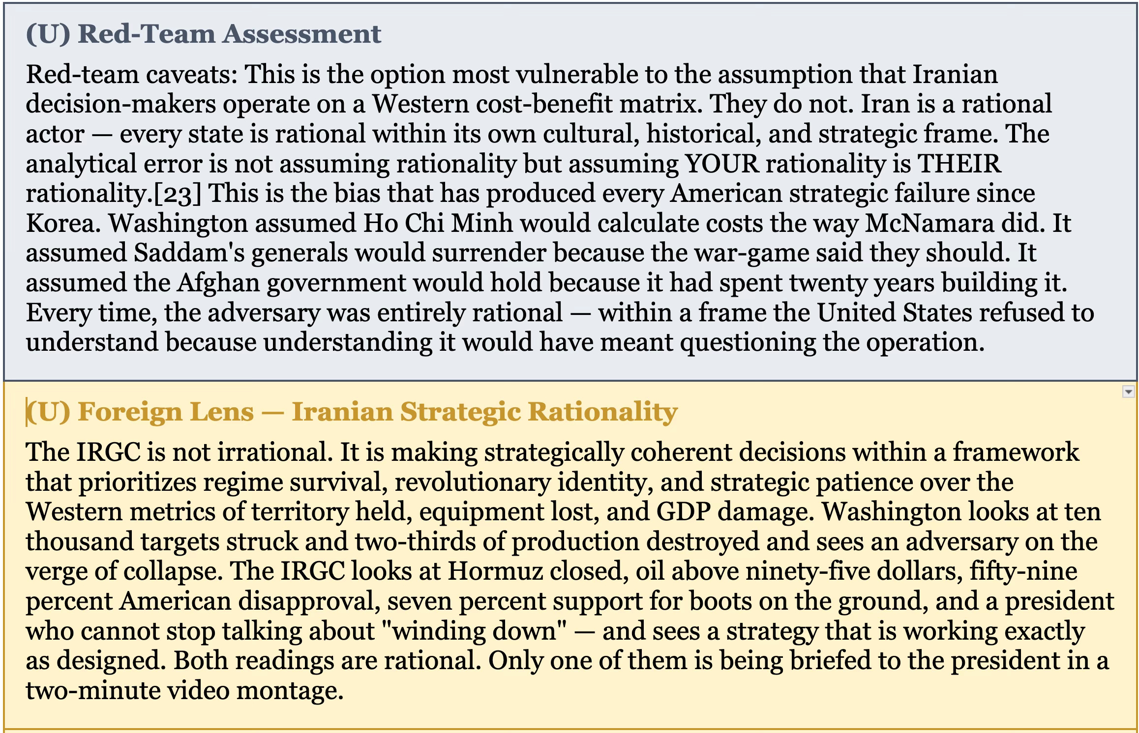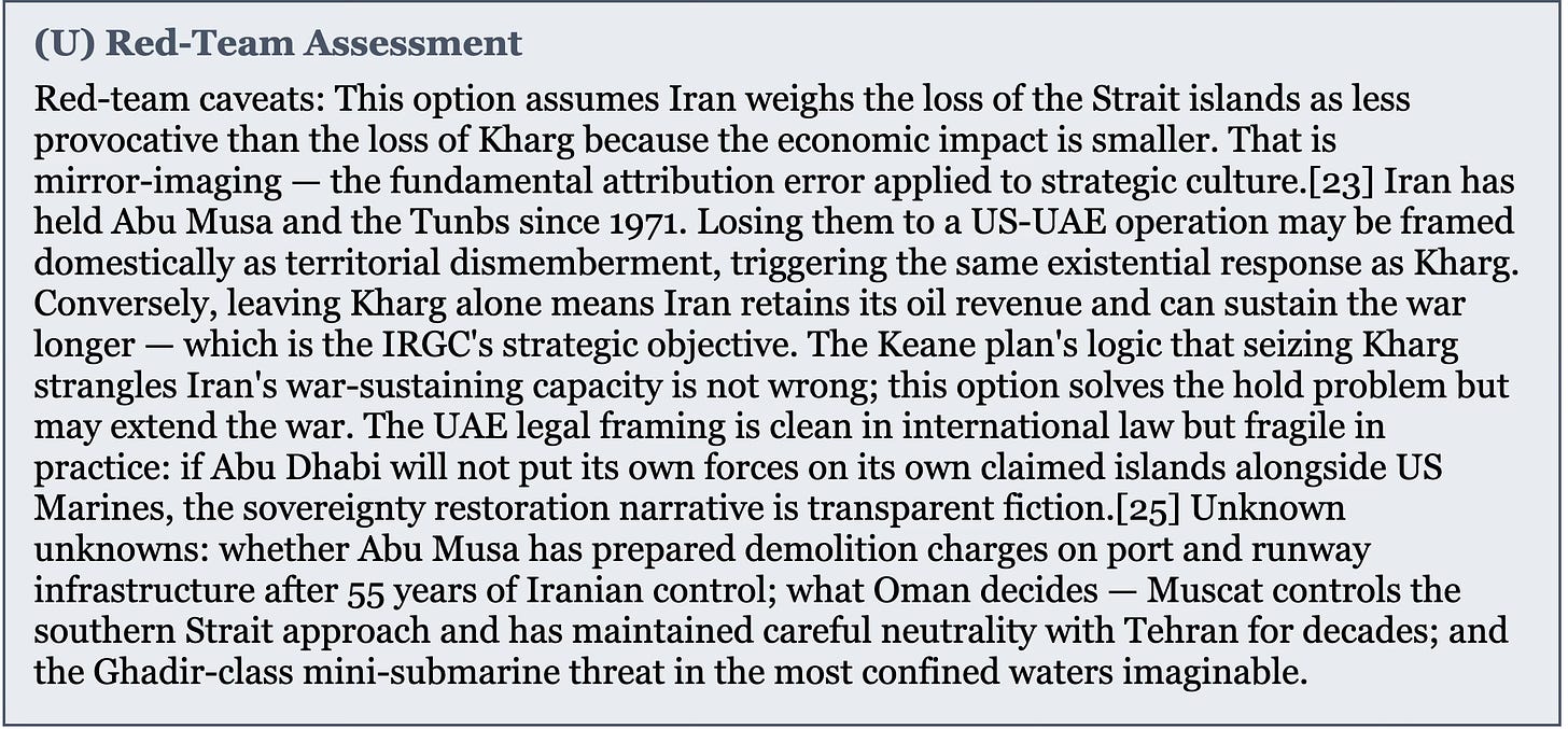 [23] NSD’s red-team methodology identifies two cognitive biases as particularly dangerous in military planning: the fundamental attribution error (assuming the adversary thinks the way you do) and confirmation bias (weighting evidence that supports the preferred option while discounting evidence that challenges it). The “rational actor” assumption is a specific form of the fundamental attribution error: every state actor is rational within its own cultural, historical, and strategic frame — Iran has been making strategically coherent decisions within a Persian/Shia/revolutionary framework for forty-seven years. The analytical failure is not in assuming rationality but in assuming Western cost-benefit rationality is universal. See NSD/MILab, “What is a RED TEAM?” and “RED TEAM Methodology” — milab.substack.com.