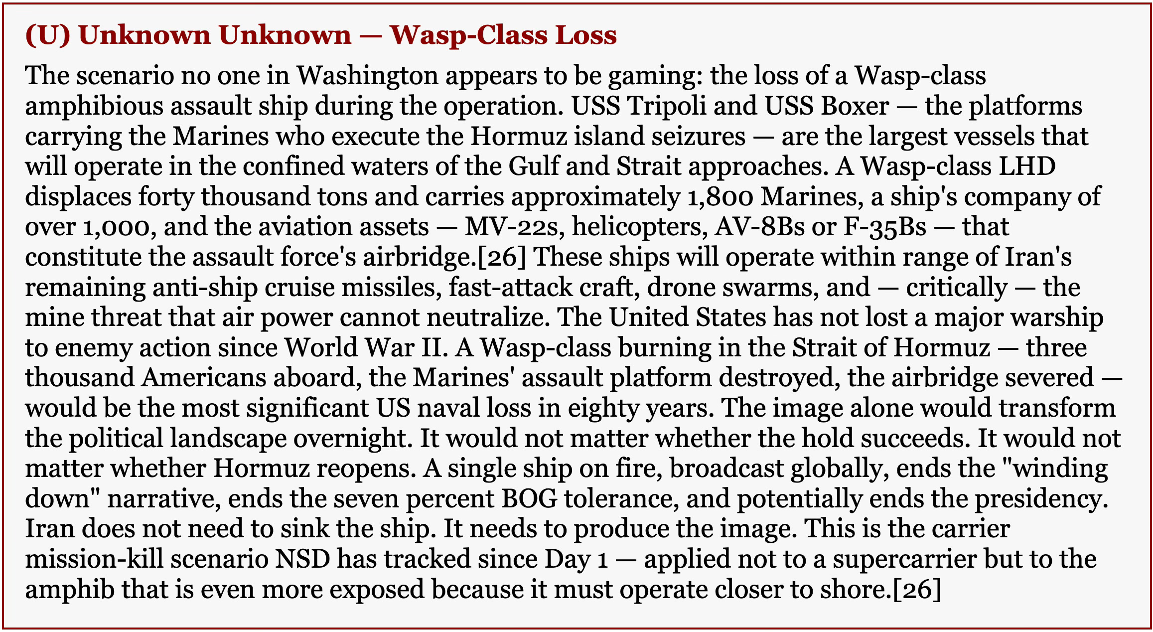 [26] Wasp-class Landing Helicopter Dock (LHD) vessels displace approximately 40,000 tons fully loaded, carry a Marine Expeditionary Unit of roughly 1,800 Marines plus a ship’s company of over 1,000, and embark a mixed aviation element of MV-22 Ospreys, CH-53 heavy-lift helicopters, AH-1Z attack helicopters, and (on some deployments) F-35B Lightning II short takeoff/vertical landing fighters. USS Tripoli (LHA-7, America-class, slightly larger) and USS Boxer (LHD-4, Wasp-class) are the two amphibious flagships converging on the Gulf as of March 26. The United States has not lost a major warship to enemy action since the sinking of USS Indianapolis in 1945. The confined waters of the northern Gulf and Strait of Hormuz place these vessels within range of anti-ship cruise missiles, fast-attack craft, drone swarms, and — most critically — the mine threat that air power cannot neutralize. The NSD SITREP worst-case scenario tracker has assessed a carrier or amphib mission-kill as LOW-MEDIUM probability and CATASTROPHIC consequence since Day 1 of the campaign.
