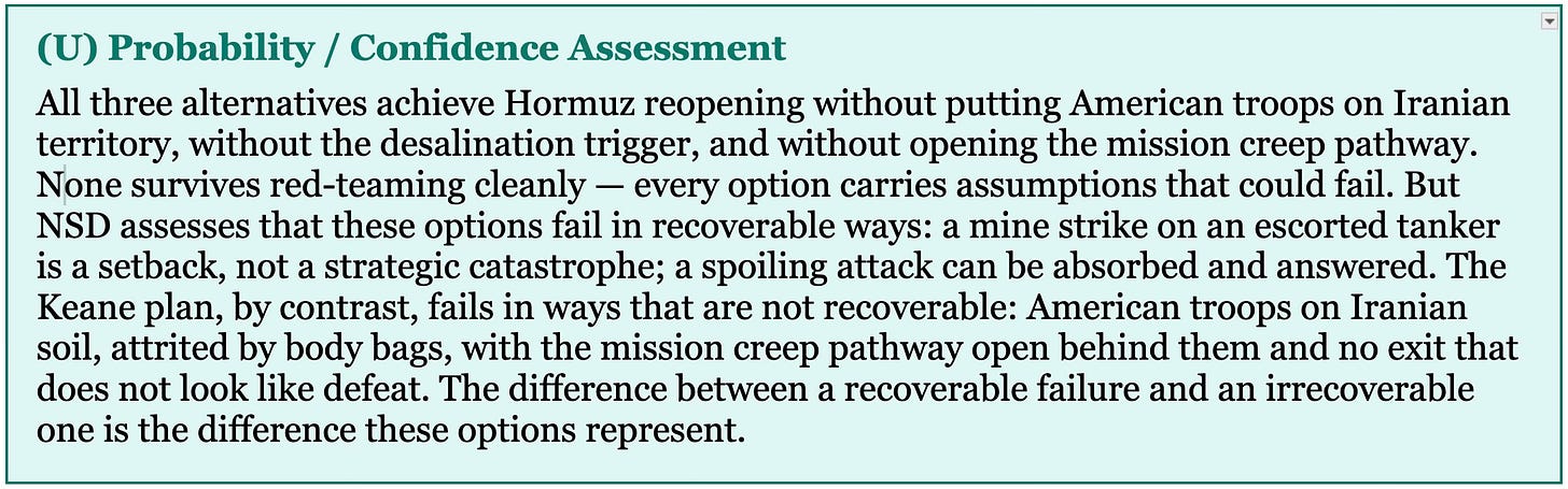 The strategic objective is singular: reopen the Strait of Hormuz to commercial shipping. Everything else — Kharg, oil leverage, regime pressure — is secondary or derivative. If the military operation is designed around that objective alone, rather than around a president’s desire for a dramatic stroke, different options emerge. Three exist that directly serve the stated objective without committing US troops to Iranian soil. The fact that the Keane plan is the frontrunner tells you something about the decision-making environment — it is the most dramatic option, not necessarily the most effective one.