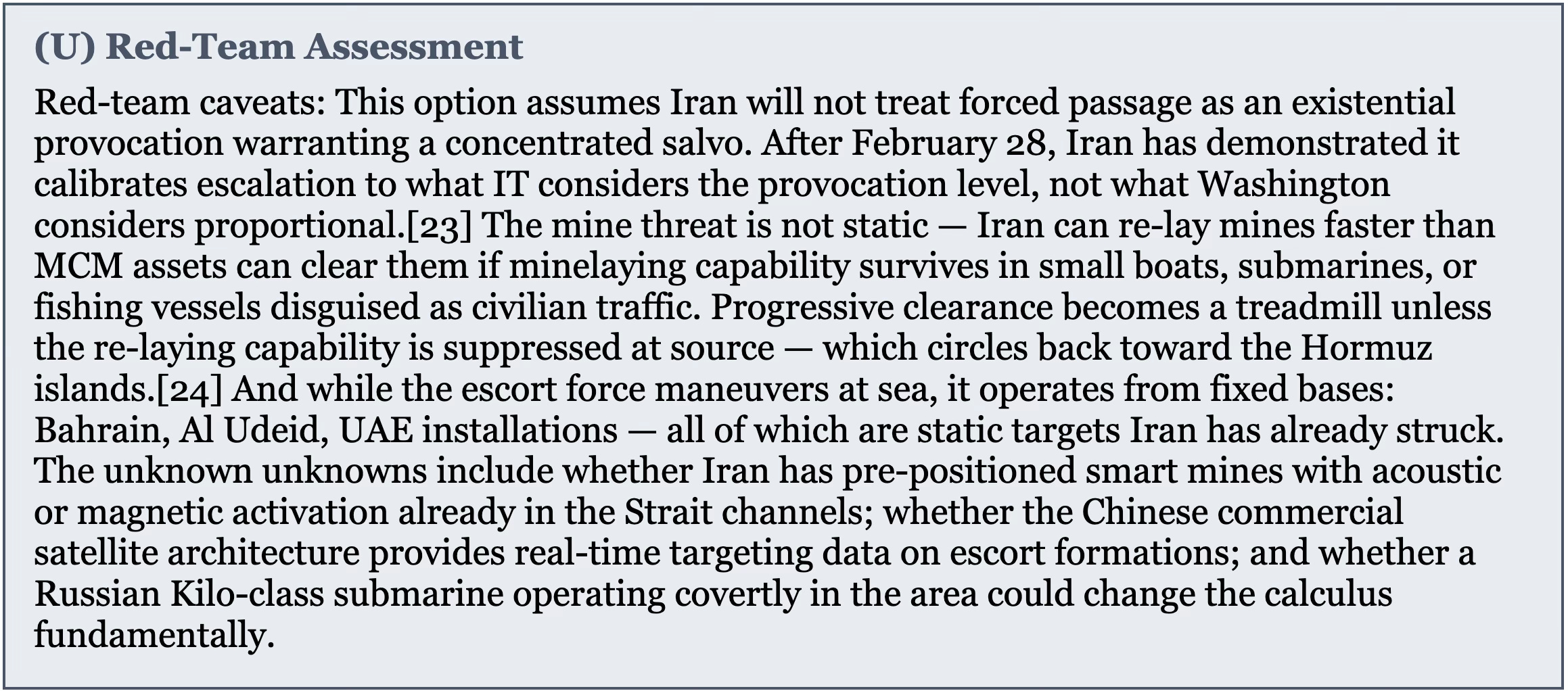 [24] Iran’s mine warfare capability is extensive. The Iranian inventory includes contact mines, influence mines (acoustic and magnetic), and moored mines deployed from a variety of platforms including surface combatants, submarines, fast-attack craft, and civilian vessels. During the 1987-88 Tanker War, Iran used the commercial vessel Iran Ajr to lay mines covertly — a capability that has only expanded in the subsequent four decades. The progressive clearance assumption in the escort option is particularly vulnerable to this re-laying capability.