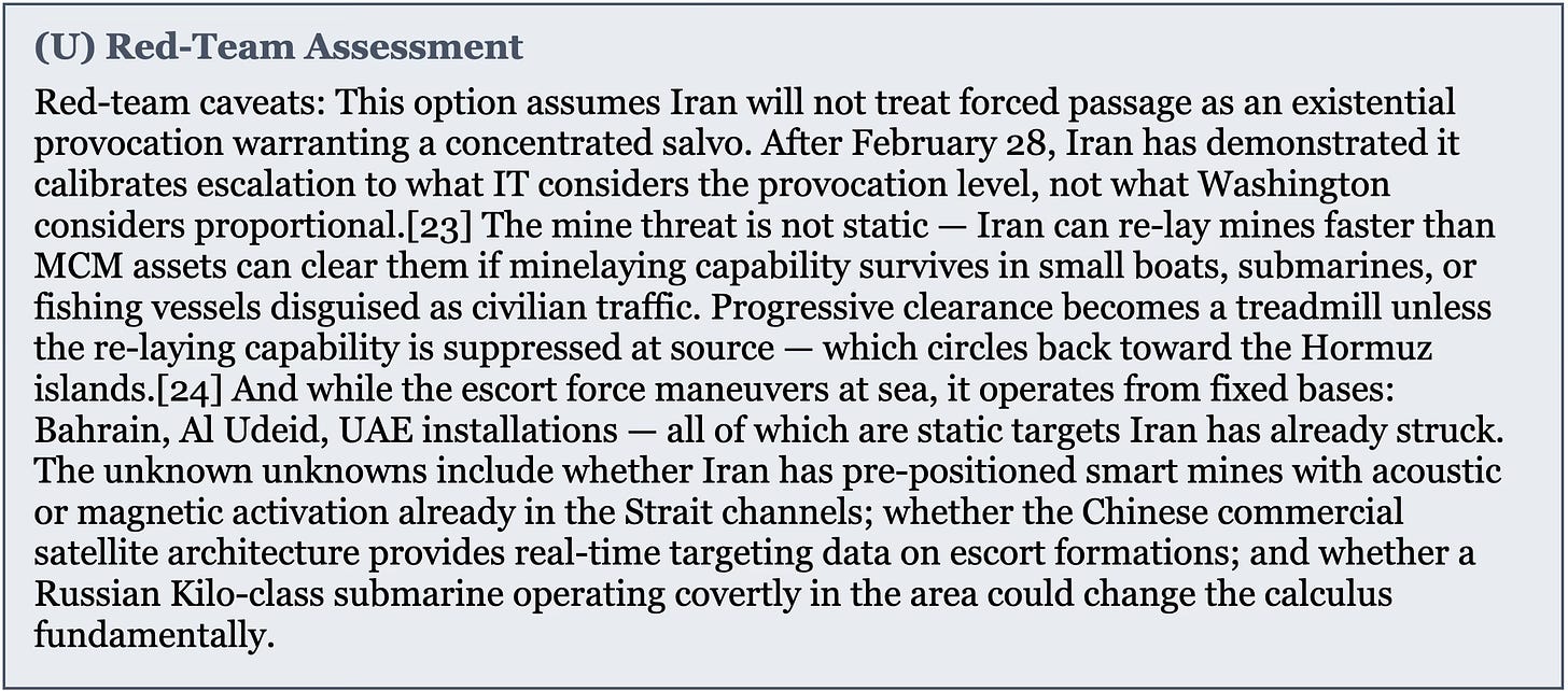 They define success as severely degrading Iran’s capabilities and reopening the Strait of Hormuz. Fine. But at what human cost — and for how long? If the IRGC survives, the threat regenerates. You are on a permanent treadmill. And the operation that is supposed to produce “success” created the very problem the success is defined by solving. There was no Hormuz problem before February 28. That is not defeatism. That is a fact.